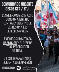 Según sus compañeros de AFFAJ “no hay motivos para su detención, se la llevaron por su defensa a los a los trabajadores de la economía popular. Es persecución política”.