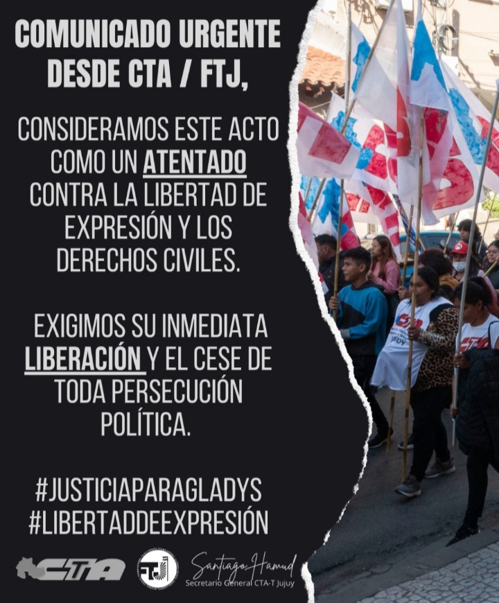 En un comunicado la Central de Trabajadores de la Argentina (CTA) de Jujuy sostuvo lo siguiente: “CONSIDERAMOS ESTE ACTO COMO UN ATENTADO CONTRA LA LIBERTAD DE EXPRESIÓN Y LOS DERECHOS CIVILES”.